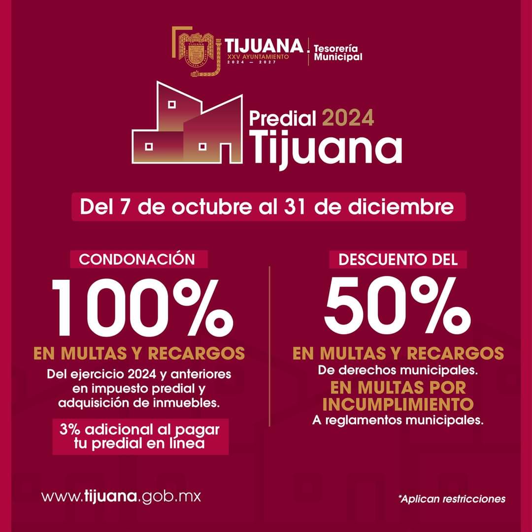 El acuerdo impulsado por el Presidente Municipal, Ismael Burgueño Ruiz, establece que durante su vigencia a las y los tijuanenses que realicen el pago del Impuesto Predial y del Impuesto Sobre Adquisición de Inmuebles, se les condonará el 100% de las multas y recargos generados por incumplimiento en su pago, respecto al ejercicio fiscal 2024 y años anteriores.