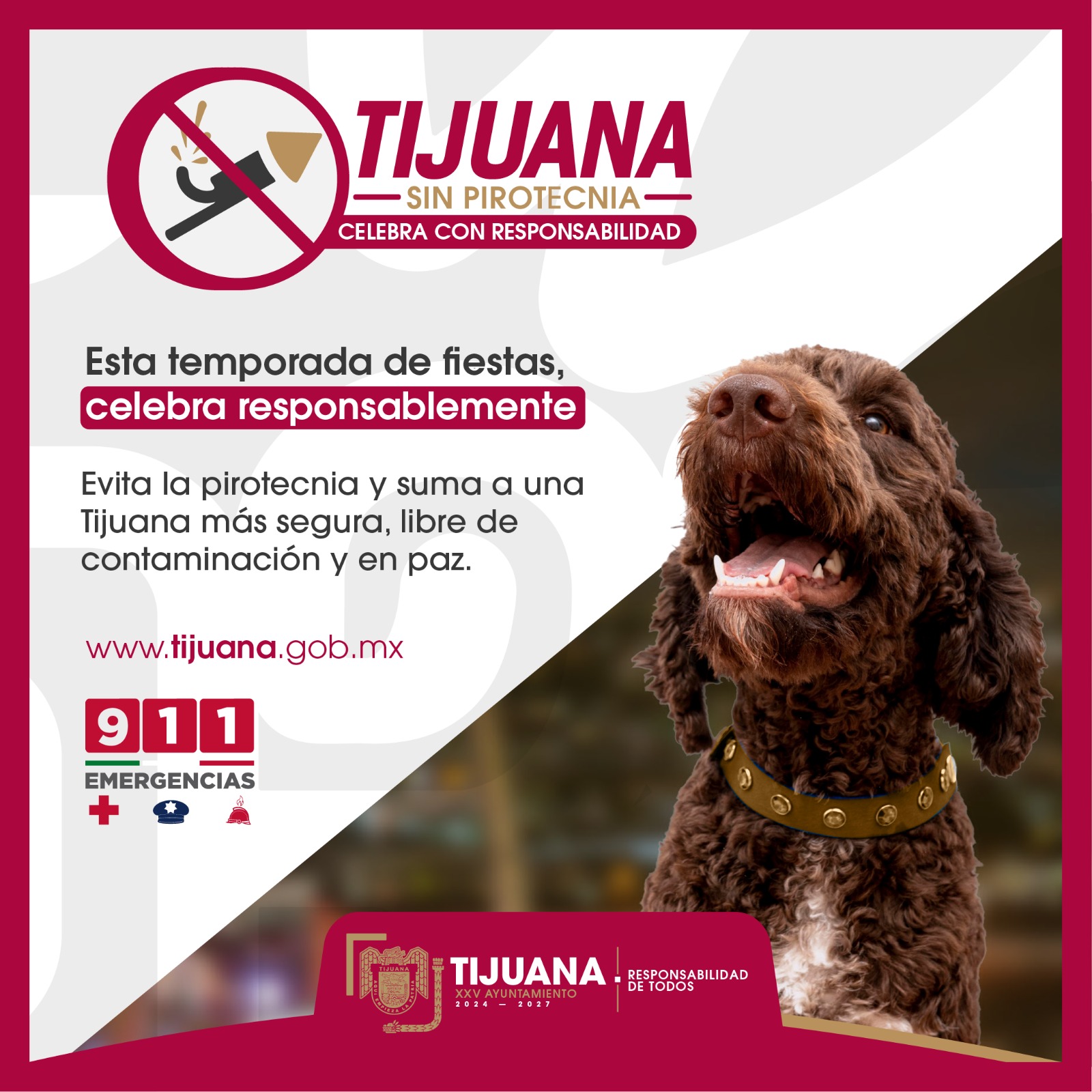 Tijuana, Baja California, 22 de diciembre de 2024.- Con motivo de la temporada navideña y de fin de año, el XXV Ayuntamiento de Tijuana que encabeza el Presidente Municipal, Ismael Burgueño Ruiz hace un llamado a la población a reforzar el cuidado de las mascotas, evitando el uso de la pirotecnia.