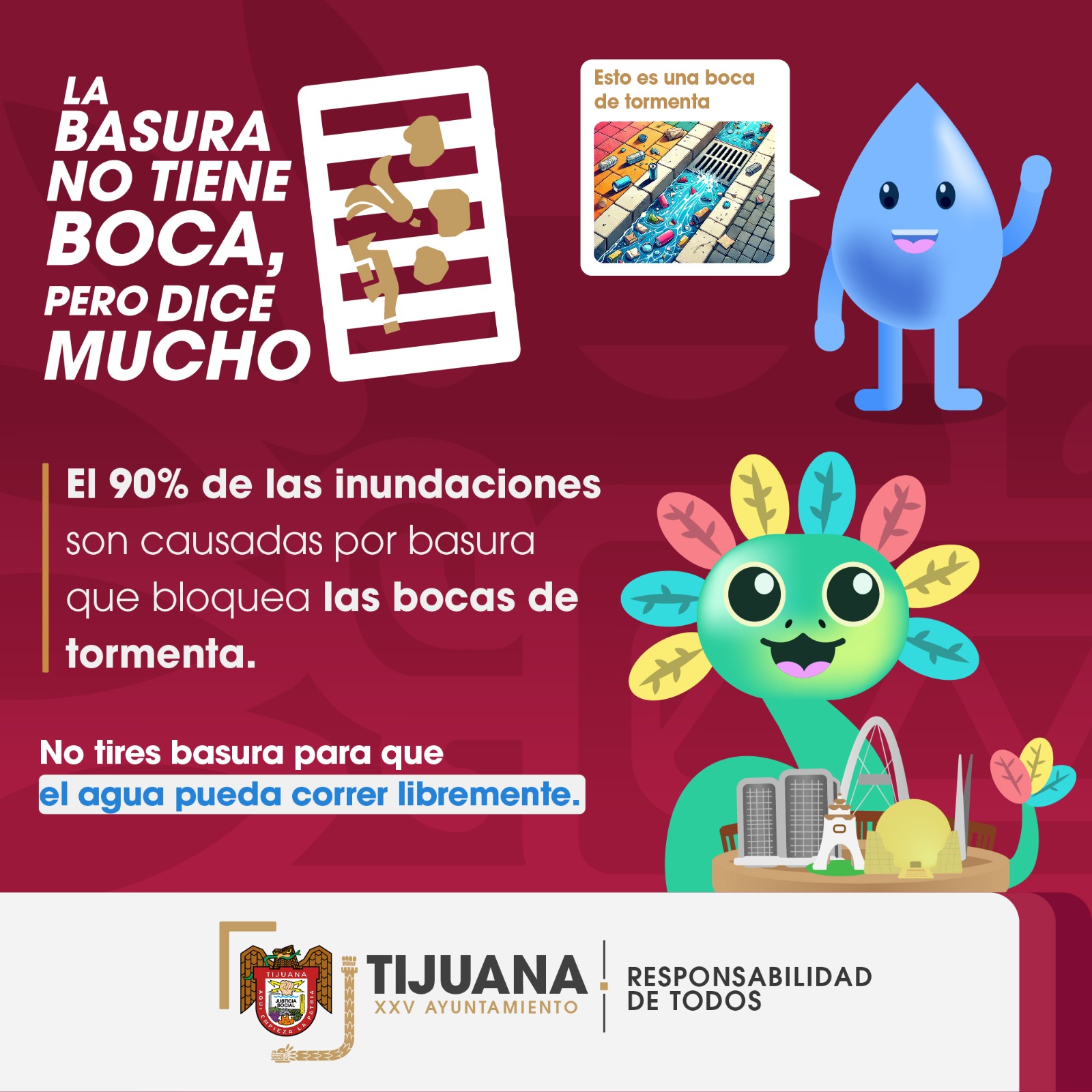 De acuerdo a información de la SDTUA, el 90% de las inundaciones son causadas por basura que bloquea las bocas de tormenta, en este sentido, la importancia del llamado a evitar arrojar basura y permitir que el agua corra libremente.